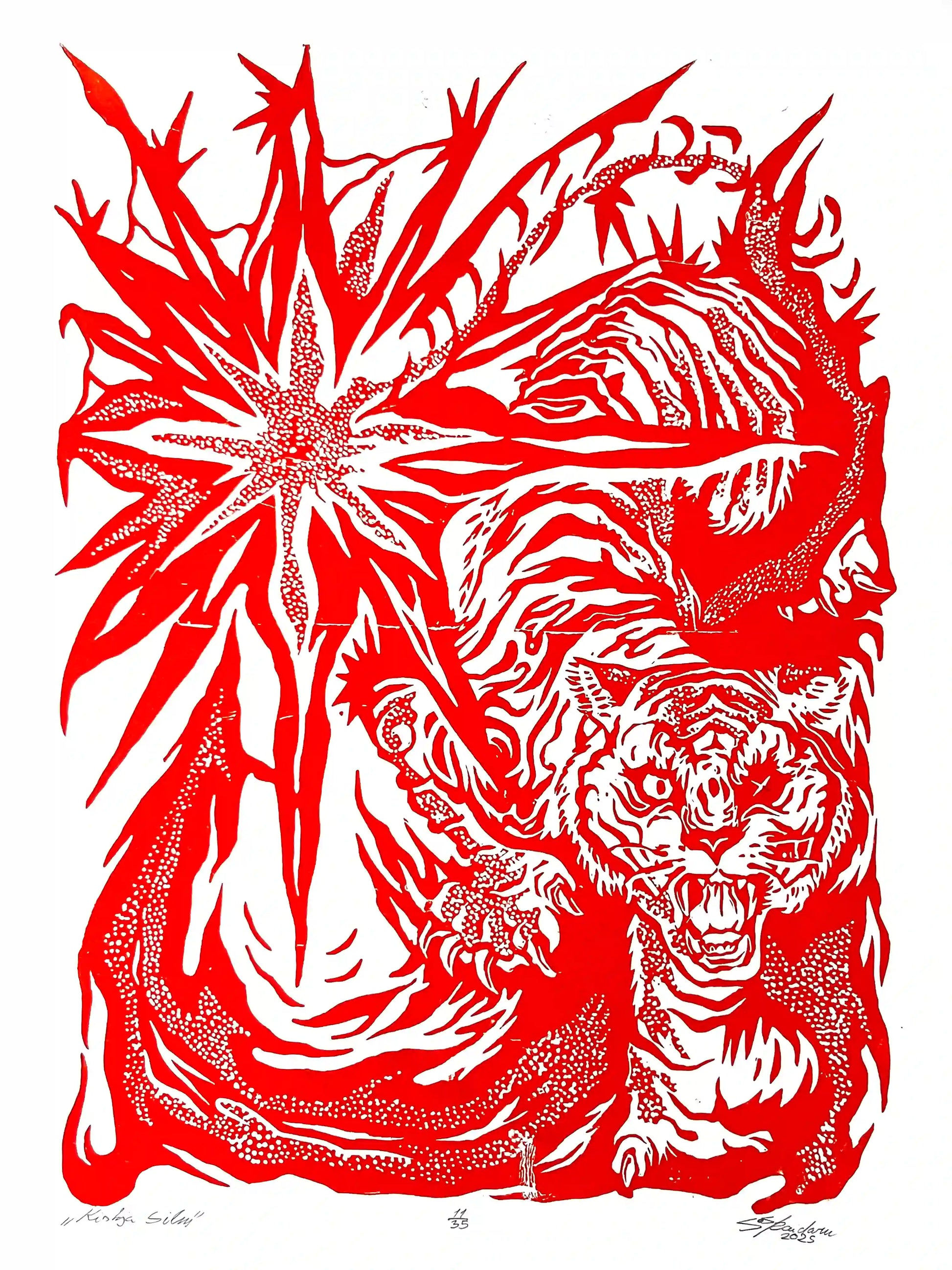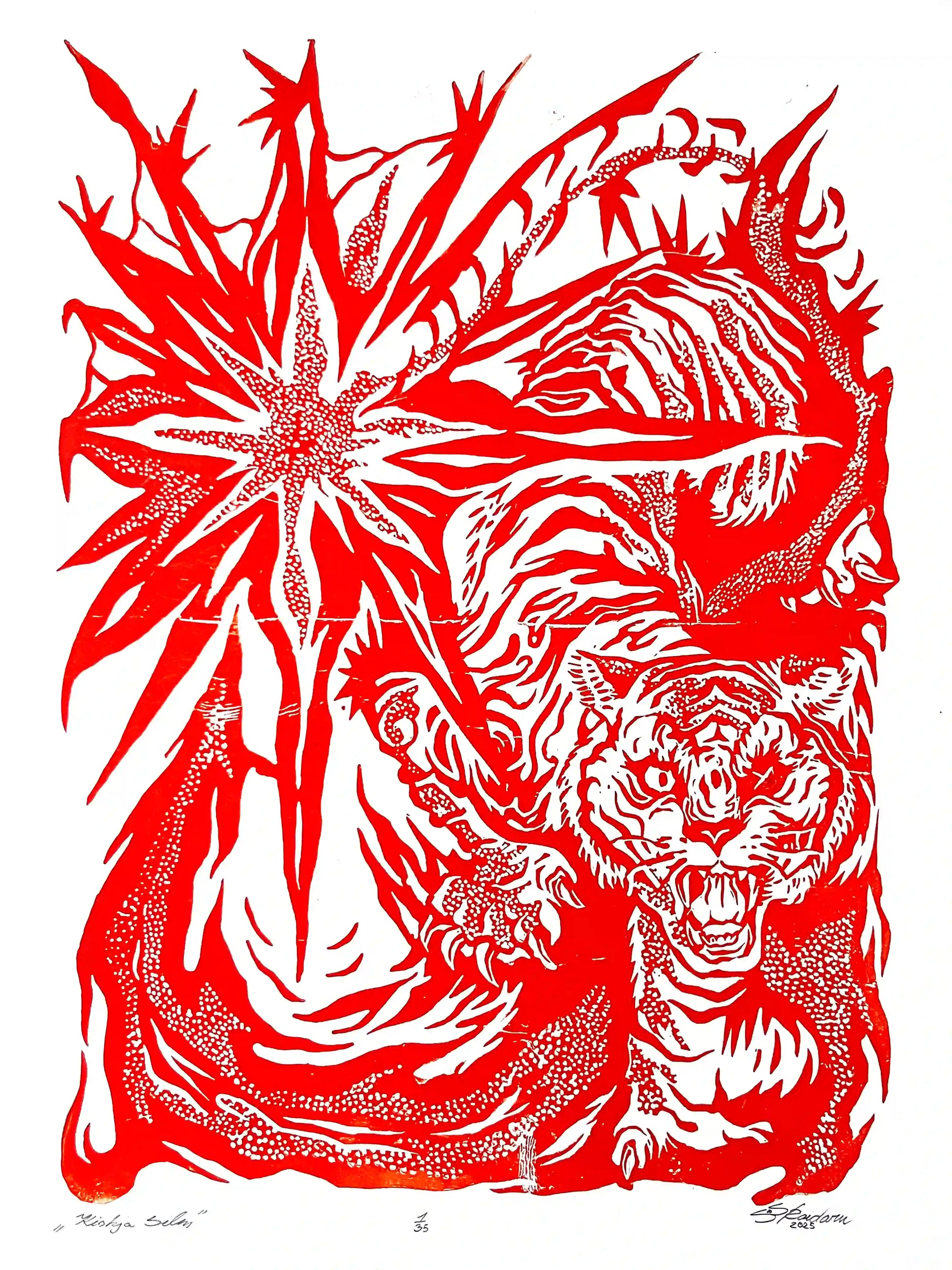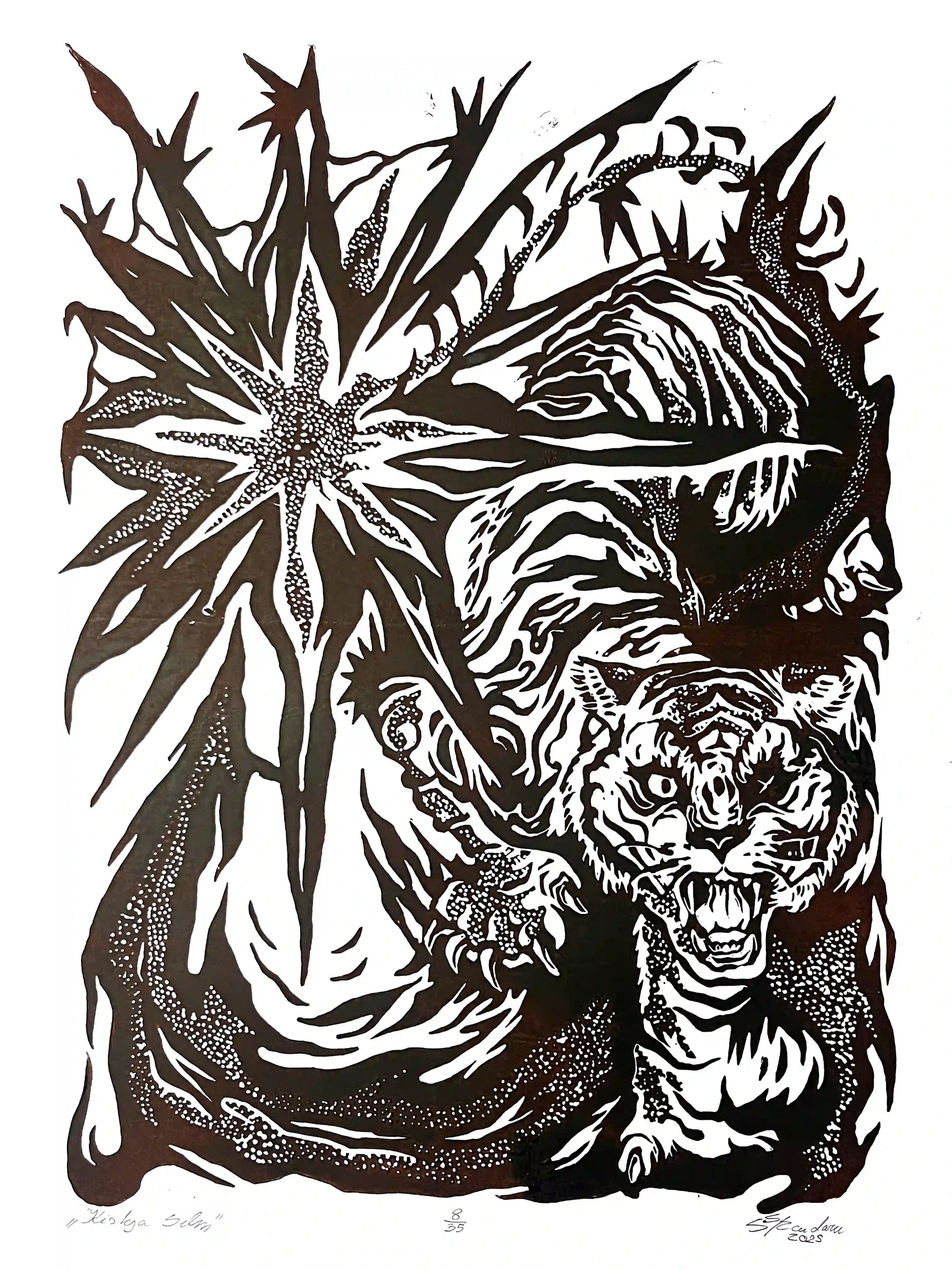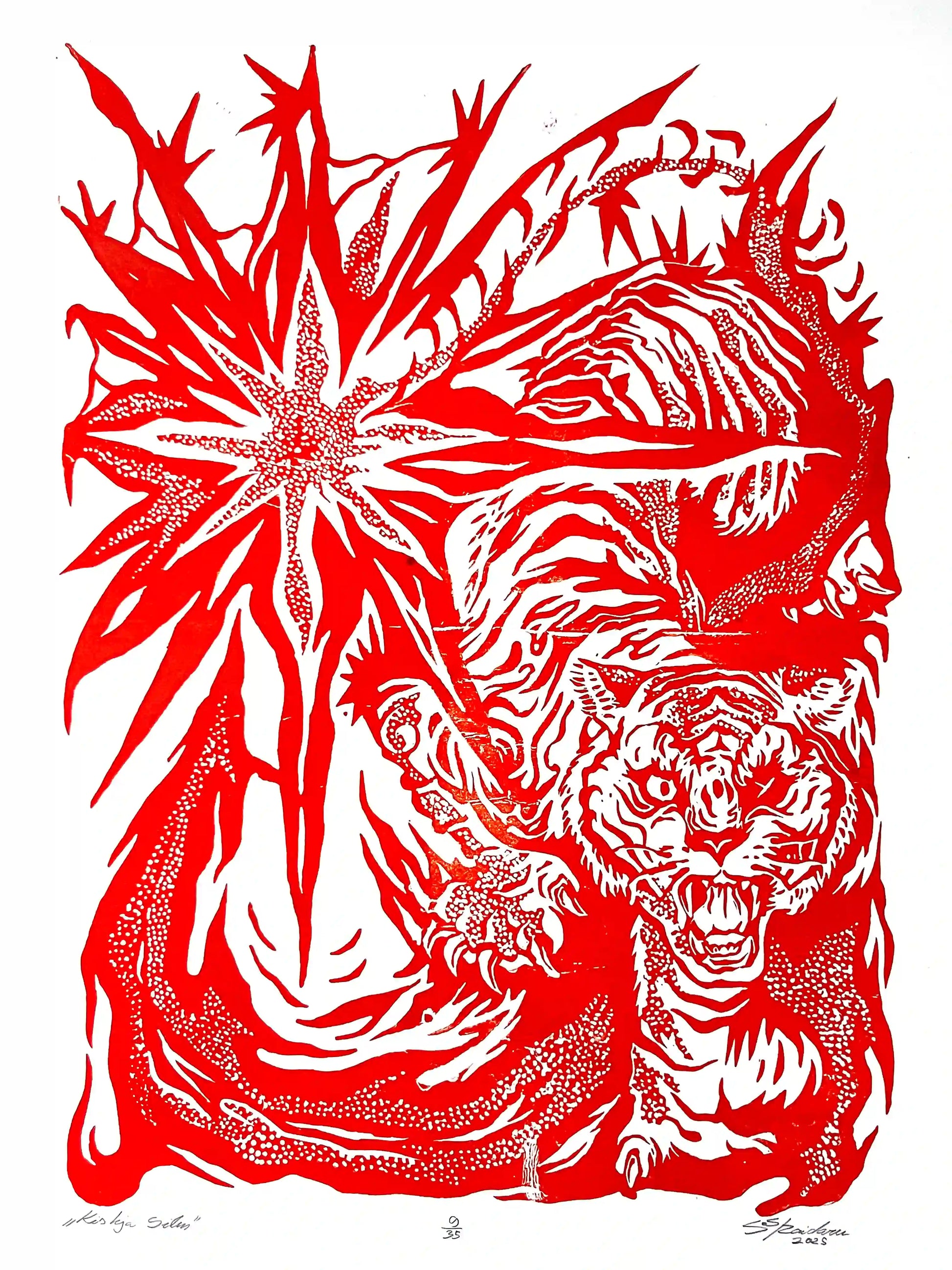 This linocut print captures that moment of awareness, where myth and instinct meet. Each hand-carved detail channels the wild rhythm of the forest, inviting the viewer to confront their own inner wilderness through the gaze of the predator’s eye.