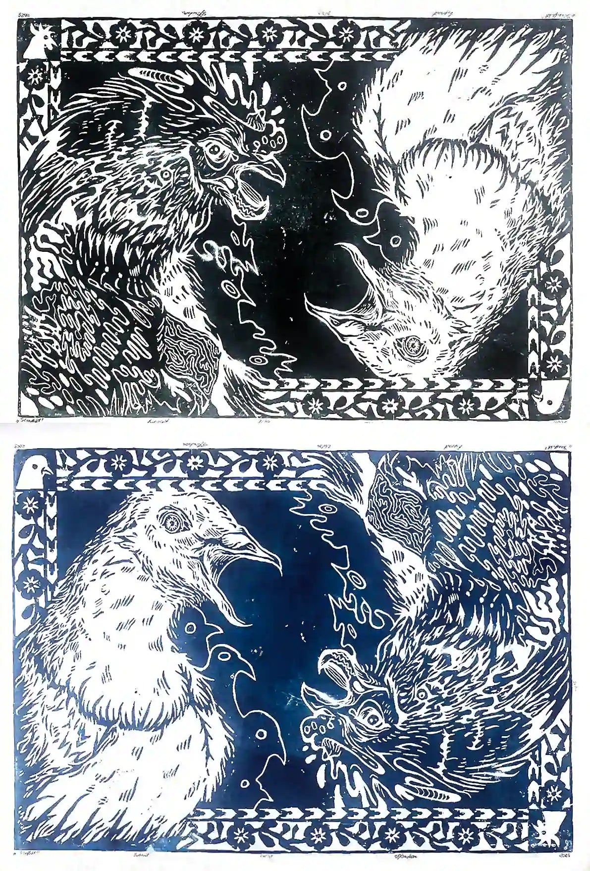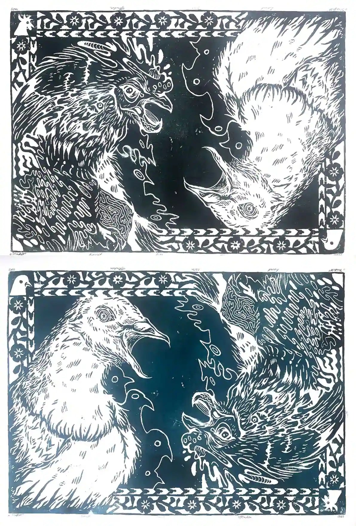 This Estonian folklore linocut print was born from an inner conflict — the artist’s indecision between life in the countryside or the city. Represented by two birds, the chicken symbolizes rural life, while the pigeon embodies urban existence. This linocut print is versatile and can be displayed in either orientation, allowing viewers to choose which side resonates with them.