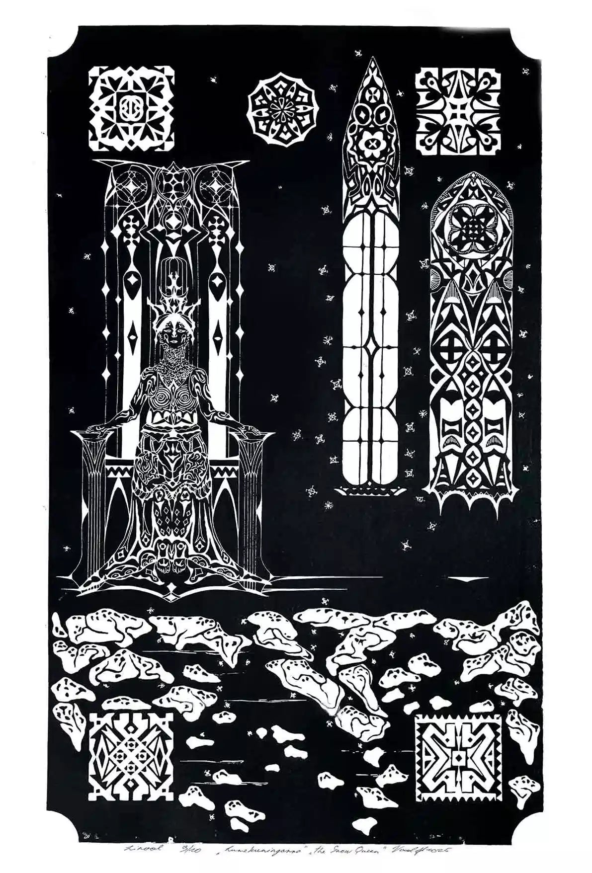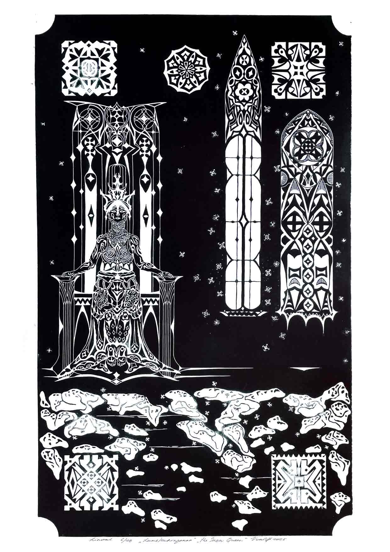 The queen and the creator of the snowflakes. Her palace and gardens of ice are in the lands of permafrost. Tall and beautiful she sits on her throne, wearing an armor of frost.