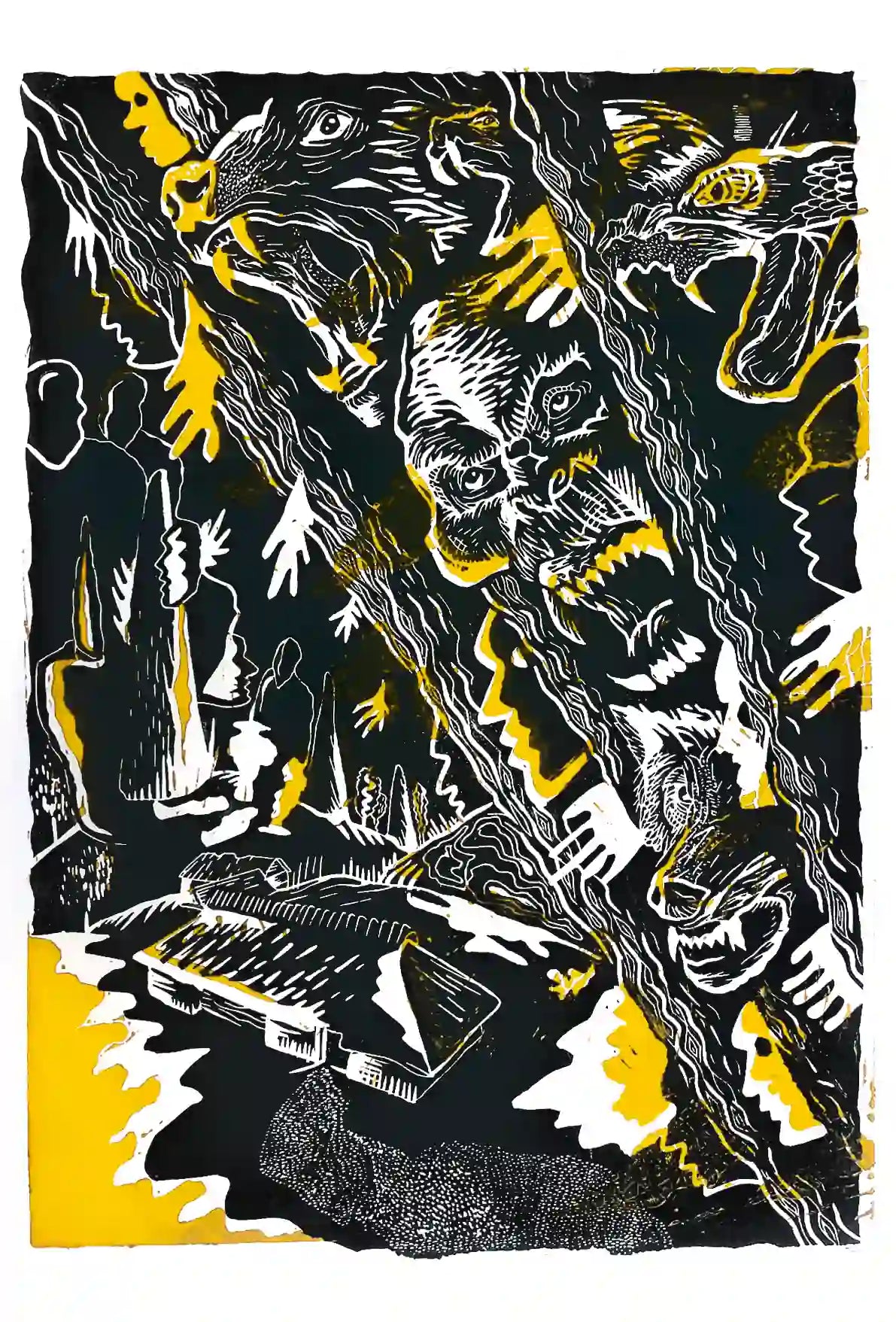 This Estonian folklore linocut print is inspired by a book deeply rooted in local myths and traditions. It tells a story of transformation — the onslaught of new customs and people slowly erasing the old. Through bold lines and textures, this linocut print captures the essence of fading folklore and the quiet strength of cultural memory.